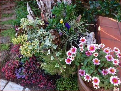流木の植木鉢の中と周りに先日のビオラと