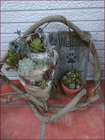 ご紹介。赤く塗ったジョウロに植えた琴爪菊。