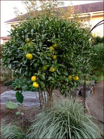 菜園入り口で柚子が色づいてきました。